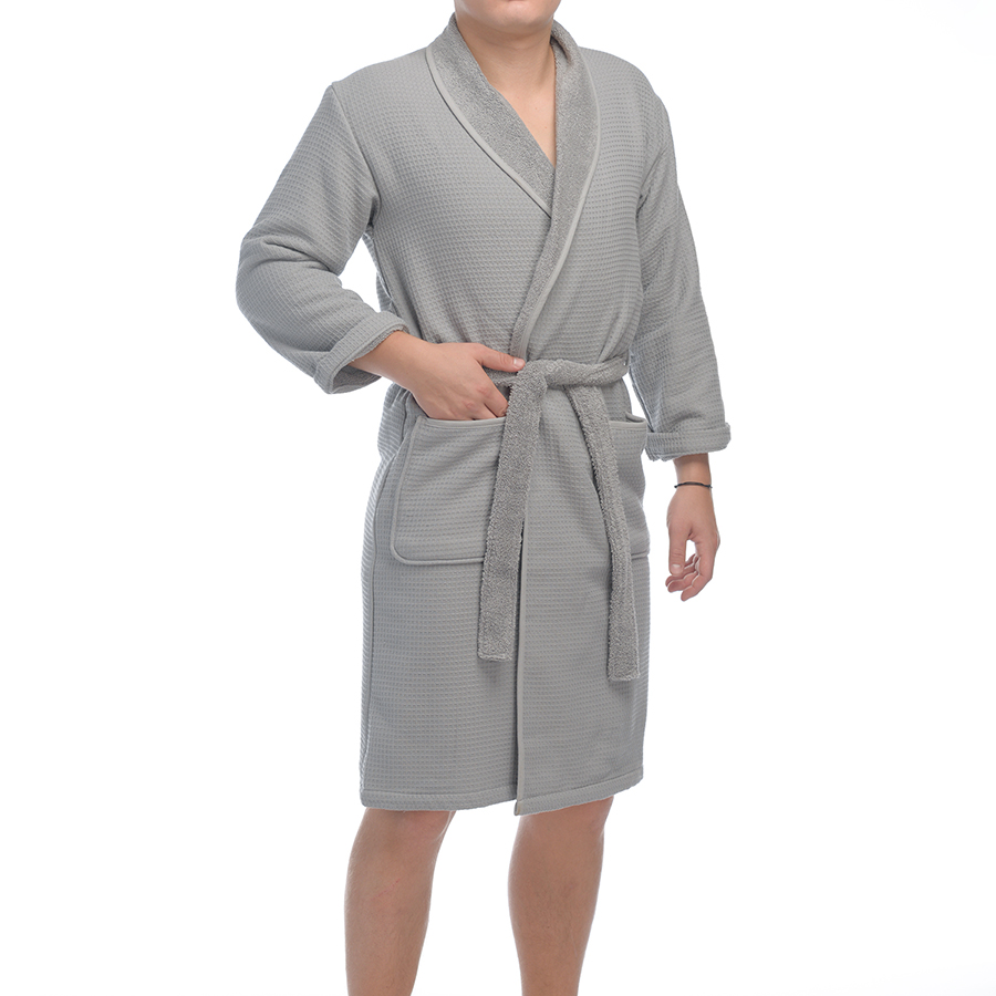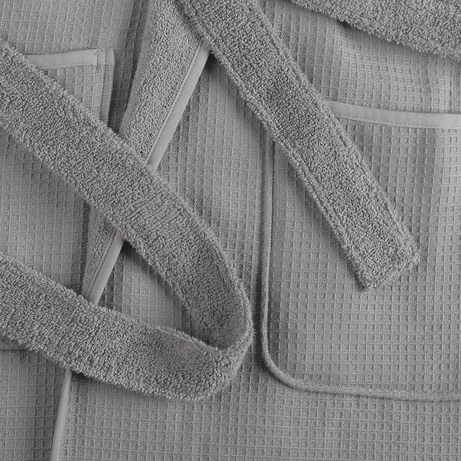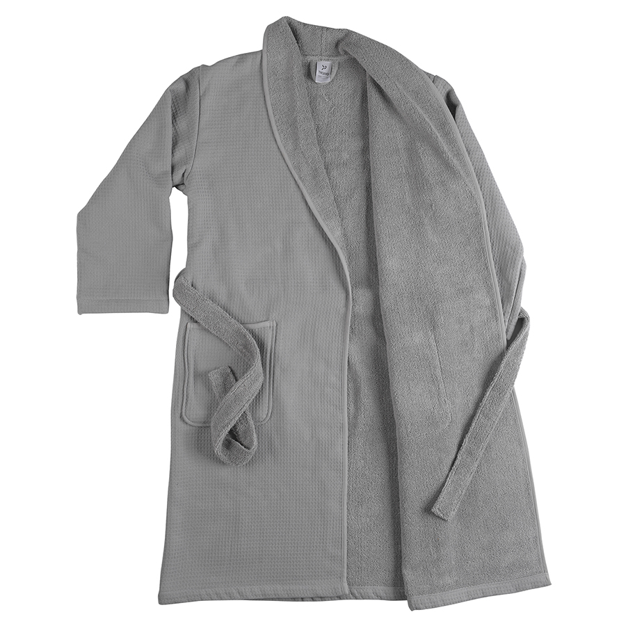 Халат банный из чесаного хлопка серого цвета из коллекции Essential подарит ощущение нежности и чувство комфорта после душа или ванны и придётся по душе ценителям натуральных материалов. Изделие выполнено из хлопка повышенной гигроскопичности Aqua Fibro, созданного по специальной технологии скручивания. Воздушные микроотверстия между волокнами и внутри нитей придают ткани объем и отличные впитывающие свойства. Внешняя сторона халата имеет вафельную фактуру, а внутренняя – махровую. Халат отличается особенной износостойкостью, хорошо держит форму и сохраняет качественные свойства на протяжении долгого времени. Модель с шалевым воротником дополнена двумя накладными карманами по бокам.