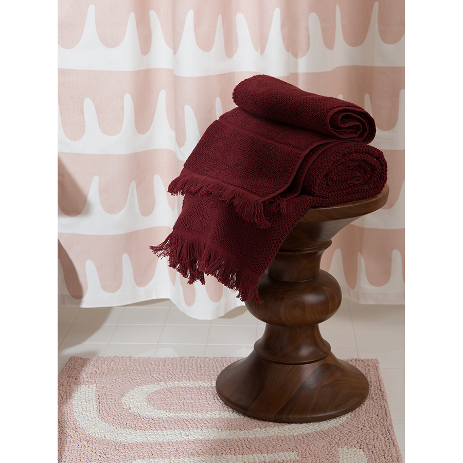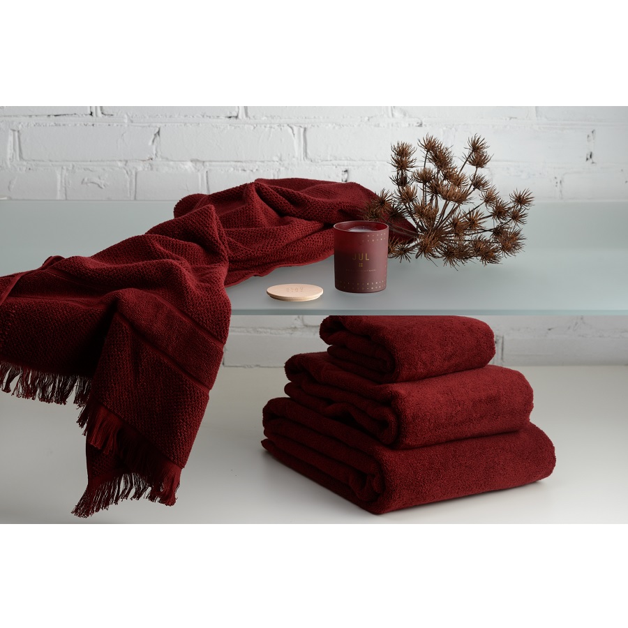 Бордовое полотенце для рук с бахромой из коллекции Essential понравится тем, кто любит качественный и стильный текстиль. Мягкая, при этом прочная пряжа изготавливается из лучших сортов длинноволокнистого хлопка методом тщательного прочесывания, что значительно улучшает ее качественные характеристики. Полотенце хорошо держит форму и сохраняет впитывающие свойства на протяжении длительного времени. Модель украшена фактурным узором и мягкой бахромой в тон.