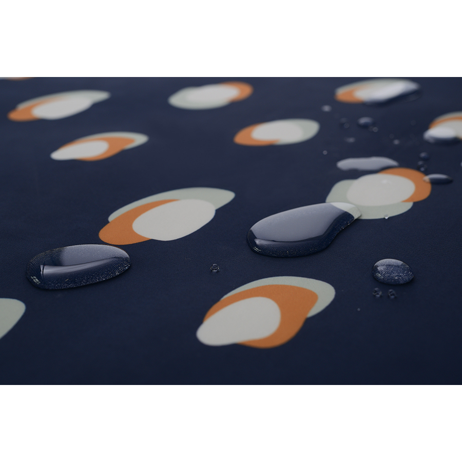 Изделие выполнено из полиэстера с водоотталкивающей пропиткой, поэтому хорошо защищает от брызг. Штора поставляется в стильной упаковке-сумочке с таким же принтом. Кольца для шторы не входят в комплект. Плотность ткани - 90GSM.